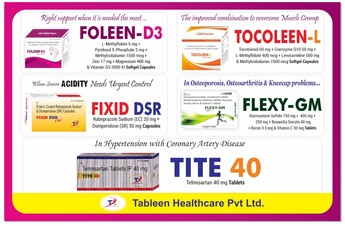 TABLEEN HEALTH CARE PVT.LTD is the patient first approach pharmaceutical company. We initiated our journey in the year 2023. We marketed a large basket of Nutraceutical and Pharmaceutical formulations covering a broad spectrum of chronic and acute therapies.